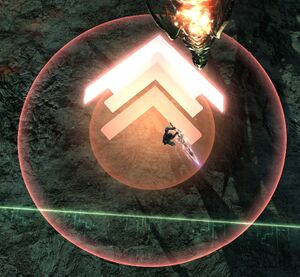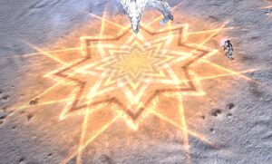 An advanced variant of the Line AoE. This attack fires multiple (usually 4) line AoEs out from an epicenter in indicated directions, creating a starburst-like pattern. Indicated by a ring of chevrons on the ground pointing outwards. The size of this telegraph is usually much shorter than the length of the AoEs.