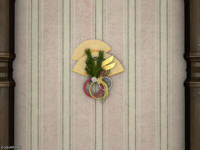“A verdantly decorated pair of authentic folding fans displayed at Heavensturn to beckon winds of fair fortune in the seasons to come.