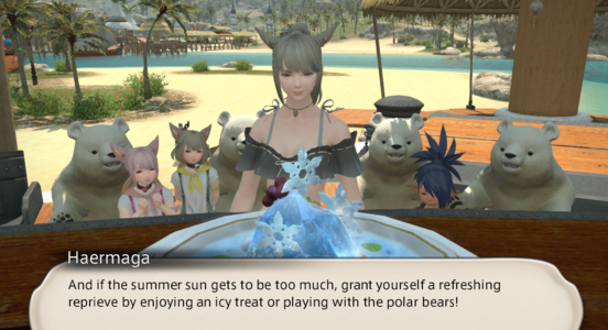 (Both) Haermaga: This year, the event is shaping up to be a thrill for visitors and staff alike! Allow me to give you a brief outline of what we have planned. Haermaga: In case the screaming and splashing hadn't given it away, we've brought back the Eorzean Nimble Warrior course with all of its explosive challenges intact! Haermaga: And if the summer sun gets to be too much, grant yourself a refreshing reprieve by enjoying an icy treat or playing with the polar bears! Haermaga: Even better, this year we've added a little Far Eastern flair with these hand fans. They're called “uchiwa,” and they drive away evil spirits, or so I'm told. Haermaga: To ensure their authenticity, we hired an expert in the art of the festival─a little Namazu fellow─to craft us a hundred crates of them! And what color could be more fitting for Moonfire than bright, blazing red? Haermaga: Seeing as the origins of the event can be traced back to the Bombard hunts of years past, I say uchiwa are a perfect fit for the spirit of the occasion─and judging from the sizable crowds, I'm far from the only one! Haermaga: The downside, of course, is that we presently find ourselves quite ill-equipped to manage a turnout of this magnitude. Personally, I'd like to bolster our security cadre if I can. Haermaga: As it stands, none of us would be able to leave our posts in the event of a serious emergency. So, given the fortuitous timing of your arrival, could I ask you to─