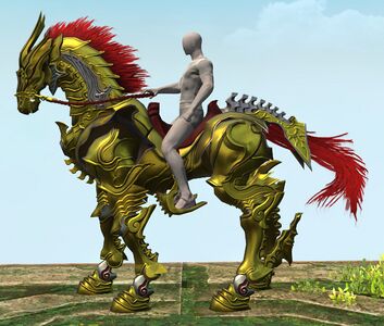 This otherworldly mount, cobbled together from the carcasses of noble beasts and armored in elaborate gold plate, is said only to accept as riders those who have proven their might and mettle on the fields of battle.