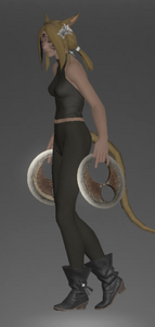 The most distinct feature of this pair of chakrams is the two asymmetrical holes on each disk. With the chakram's center of balance thus inclined to one side, it spins uniquely when thrown. The sparse ornamentation and uncharacteristically dull shades discourage apprentice dancers from drawing attention to themselves via their accoutrements, as it is believed that a beginner must learn to sway the spirits of the audience through dance alone.