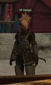 While the Scions headed to Doma to spark a rebellion to force Zenos to fight a war on two fronts, M'naago stayed behind to do what she could to rebuild the Ala Mhigan Resistance and scout new recruits. Some time later, when Doma is freed, she helps plan the next move against the Empire; Operation: Rhalgr's Beacon.