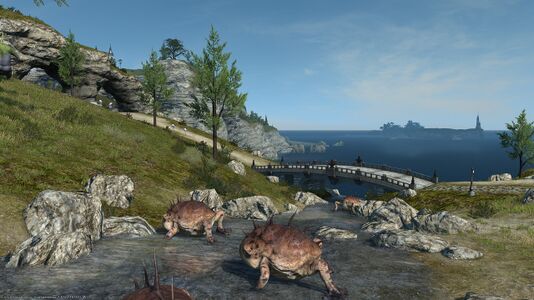 On the southern coast of Vylbrand, Moraby Bay encompasses the cove and surrounding lands - all of which one can see from just below Limsa Lominsa. This breathtaking view explains why the area is a favourite for trysts ... despite being rife with deadly stinging aureliae.