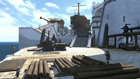 Moraby Drydocks is an area in Lower La Noscea, La Noscea. It is a settlement within The Gods' Grip. It is a large, busy shipyard operated by the sole constructor of Limsa Lominsan ships, Naldiq & Vymelli's, who have their headquarters here. Due to its importance to the city, the Maelstrom keeps the shipyard under their protection. The area was spared the brunt of the Calamity's damage due to its sheltered location, though the docks have had to work overtime since repairing and rebuilding ships. Prior to the Calamity, the shipbuilding facilities were used solely by the Armorer's Guild in order to prevent sabotage. Nowadays, with many craftsmen moved onto more pressing restoration projects, the builders have resorted to recruiting adventurers, freelancers, and former pirates in order to complete their projects.