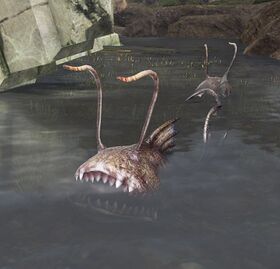 “Orobon were once the stuff of fishermen's tales, having only ever been spied on those rare occasions when one became entangled in a deepwater net. In recent years, however, these deep-water creatures have been seen in the shallows of freshwater lakes and underground pools. Due to the scarcity of prey in their native environment, orobon have evolved disproportionately large, scooping mouths.