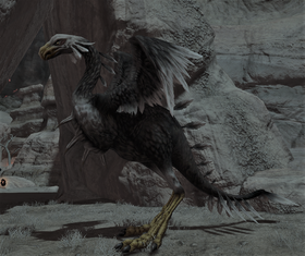“Ouzelum is a gagana of frightening size, his beak sickle-sharp and often strung with the gore of his latest victim. His stunted wings could never lift his bulk, but do not think yourself safe on higher ground—the bird’s powerful legs propel him over the largest boulders with ease. For the ‘Ananta and the M tribe of the Fringes, this flesh-craving terror has proven a constant threat to safety and sanity. In fact, several years ago there was a string of incidents involving the disappearance of the M tribe’s young. When the Miqo'te followed the trail of the suspected kidnapper, it led to one of Ouzelum’s known haunts and a heart-wrenching pile of small, gnawed bones.