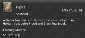 A fierce freshwater fish most commonly found in Gridania's Jadeite Flood and Black Tea Brook. Though not large or strong enough to inflict any real damage, pipira will bite the ankles of anyone who steps near them.