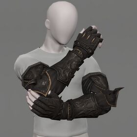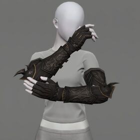 “These gauntlets are crafted from the tanned hide of Ilsabardian cattle, hardened with a special blend of alchemical solution and the blood of voidsent.