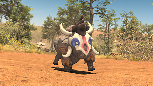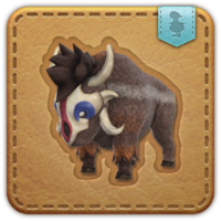 “The young of a hulking herbivore native to the continent of Tural. The patterns upon the faces of juveniles are pale and uneven, but gain in boldness and definition as they age. Even if they are still small, the creatures leave their parents' side when both their tusks and horns have sufficiently developed, as is the case with this calf.