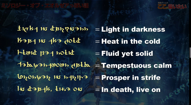 During the battle with Thaliak, when the arena becomes a triangle, several lines of Eorzean text swirl in the background. According to the 2024 Japanese Fanfest Panel, it translates to the following: