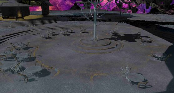 “The remnants of an extinct civilization re-created by dynamis. Round towers rise up high in the area, with an establishment reminiscent of a bar set into the base of one. The shape of the furnishings suggests that the race who once abided here resembled mankind, but the truth may never be known.