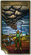 The festive commotion in the village square turned to bewildered panic as Allene rushed at the crowds, her harvest scythe in hand. She screamed at the villagers to flee into the fields, and flee they did—not for fear of the scythe, but of the unholy rage twisting the features of a woman known best for her placid nature. No sooner had the revelers taken refuge than a howling tornado tore a path of destruction through the now-empty village. As a farmer, Allene was well acquainted with the vagaries of the weather and, sensing the coming catastrophe, chose to feign a maddened attack on her neighbors rather than waste time on explanations. Celebrated for her act of resolve, Allene was raised up as a saint blessed of Nophica.