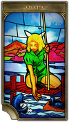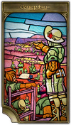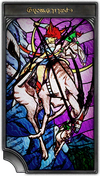 The figures thus recognized by the council become a ubiquitous sight in Eorzean society. They might appear as the subjects of theatrical productions or children’s picture books, but perhaps the most common saintly encounter for adventurers is found in the stained-crystal illustrations of leve plates. As seen below, each leve plate features the depiction of a scene from a chosen saint’s life, titled with a word which encapsulates the personage’s most prominent virtue.