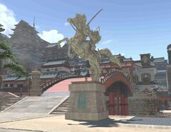 “Depicted in majestic detail astride his rearing steed is the great warlord Zuiko, revered founder of Suenokuni. While his realm occupies the southern region of Shishu encompassing Kugane, it must be noted that the port city's administration alone falls under bakufu jurisdiction.