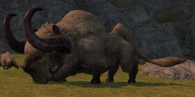 “Many of the Azim Steppe's dzos have been domesticated by the many Xaela tribes which rely on their hair, milk, and meat for survival. Tsaagan Mangas is one exception, this aggressive specimen grown large thanks to years of cunning. If one were to take this legend down, she would be seen as a hero among heroes.