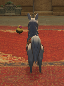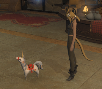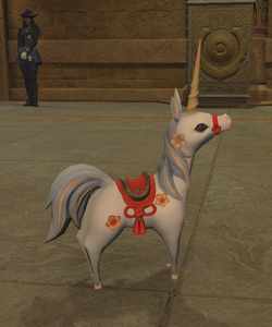 “On the occasion of the Heavensturn celebration, House Fortemps helped to secure the loan of this unicorn young to serve as the mascot for the visiting Far Eastern delegation. Though initially nervous to be away from home, the creature was able to find its stride at your side, and there it appears content to remain.