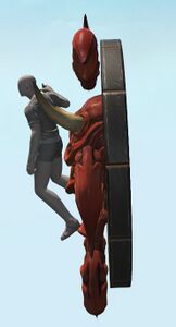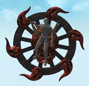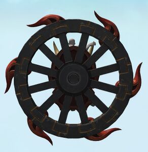 Appearing as an oxcart wheel adorned with a demonic face, this automaton originating from the Far East is created in the likeness of mythical apparitions that steal the souls of any who look upon them. While originally intended to repel intruders, it can also serve as a mode of transport for those with sufficient endurance.— In-game description